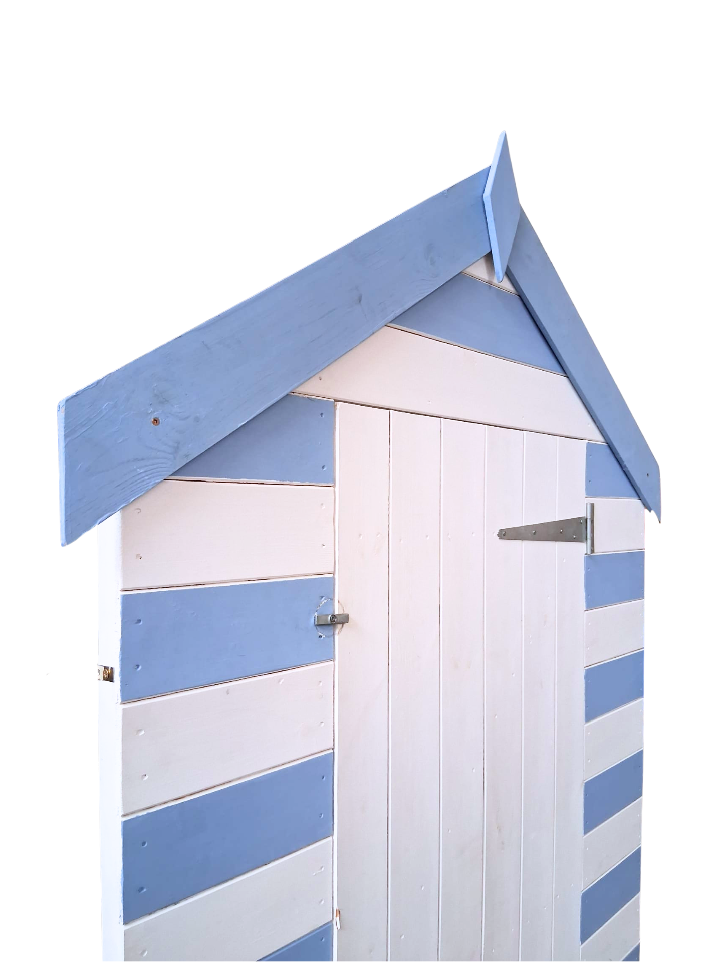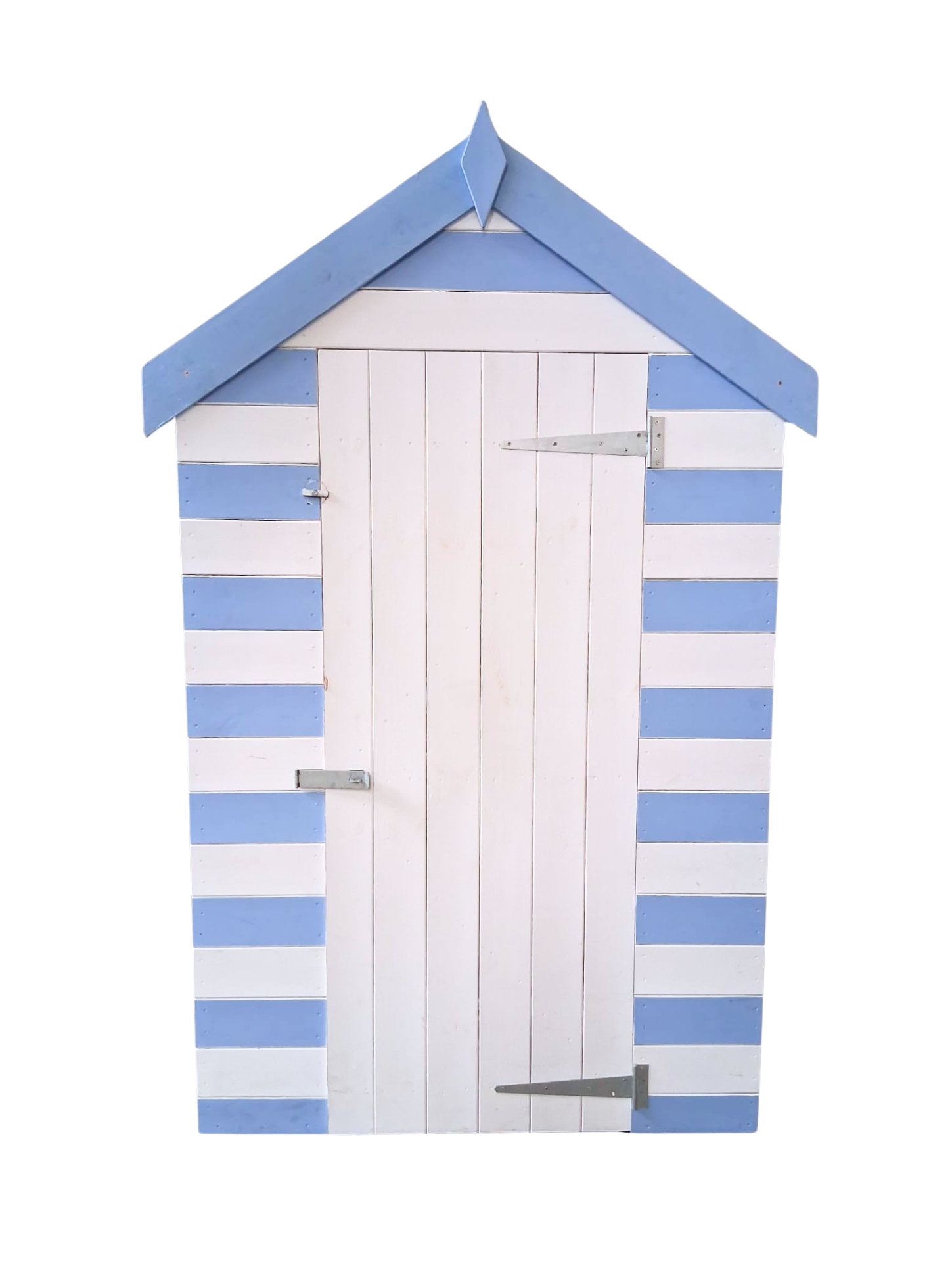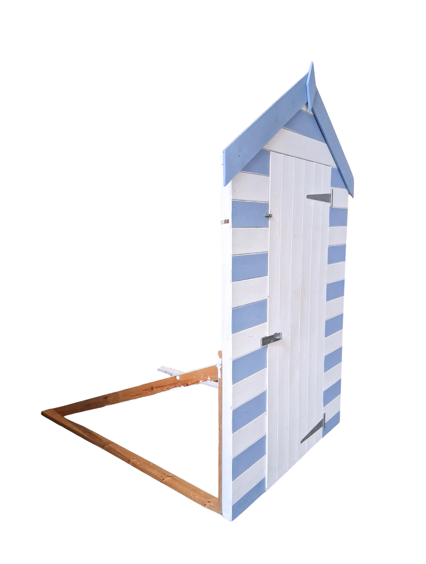0930188 A lovely blue and white painted wooden beach hut front on stand, with door that opens.