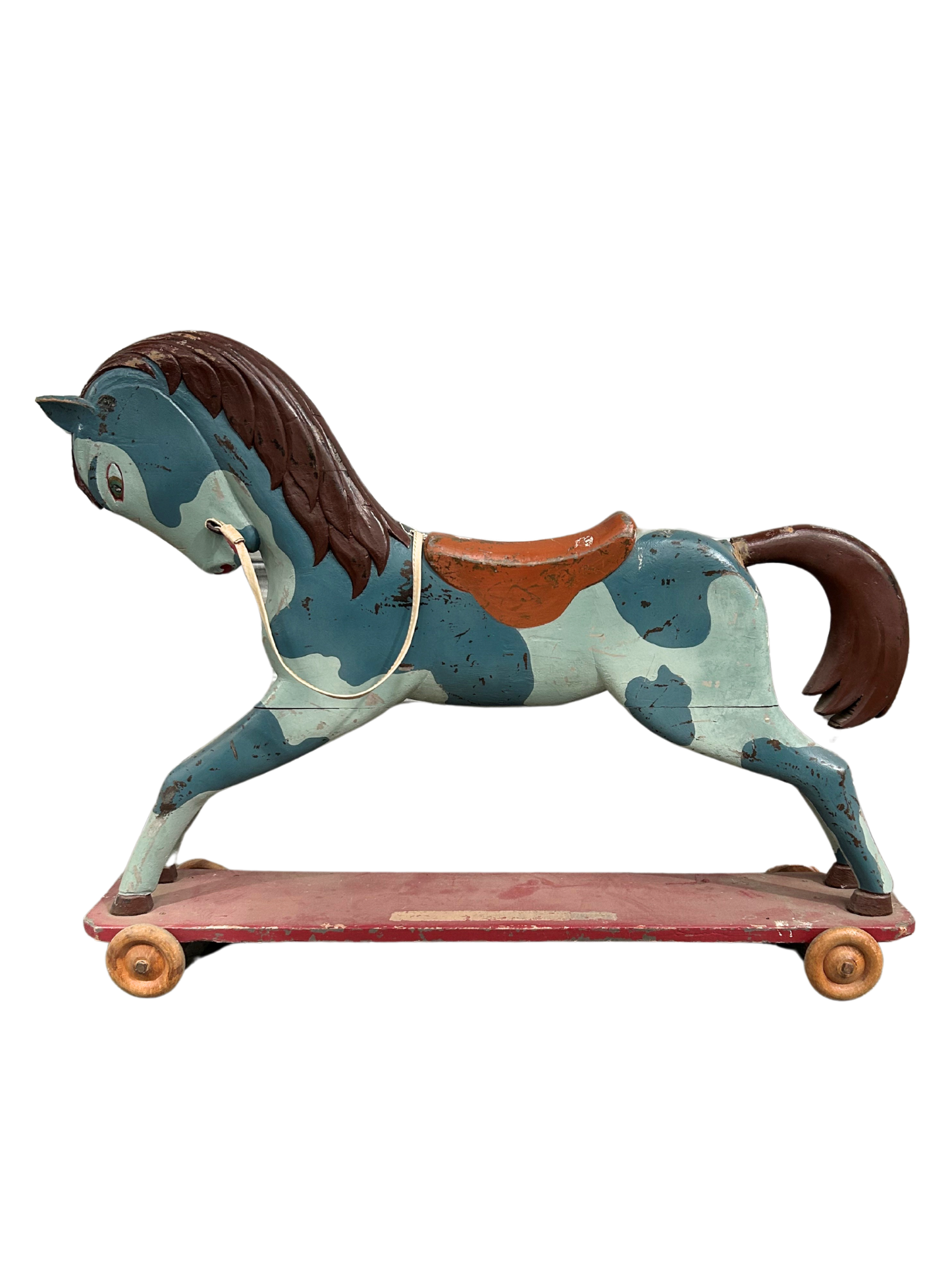 Likely from the 1940’s or 50’s. Hand painted finish with saddle and string bridle.